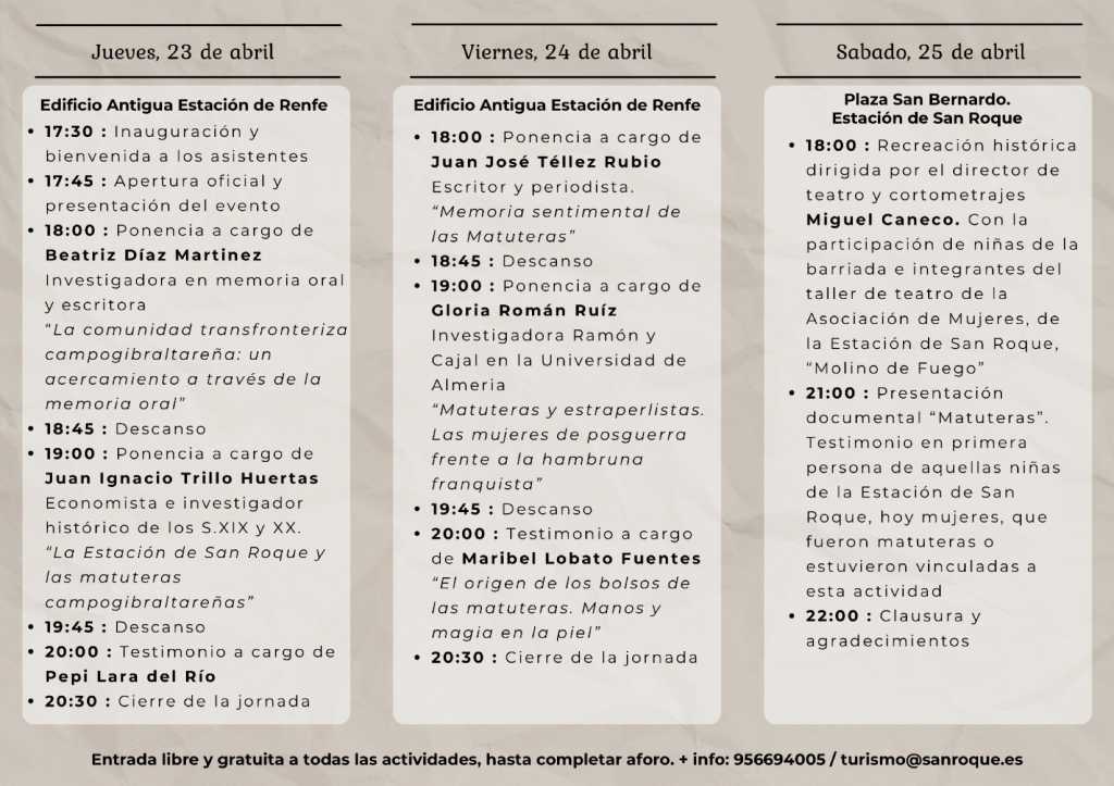A las 19 horas, Juan Ignacio Trillo Huertas, economista e investigador histórico de los siglos XIX y XX, ofrecerá la ponencia «La Estación de San Roque y las matuteras campogibraltareñas»; y la jornada se cierra a las 20 horas con un testimonio a cargo de Pepi Lara del Río.