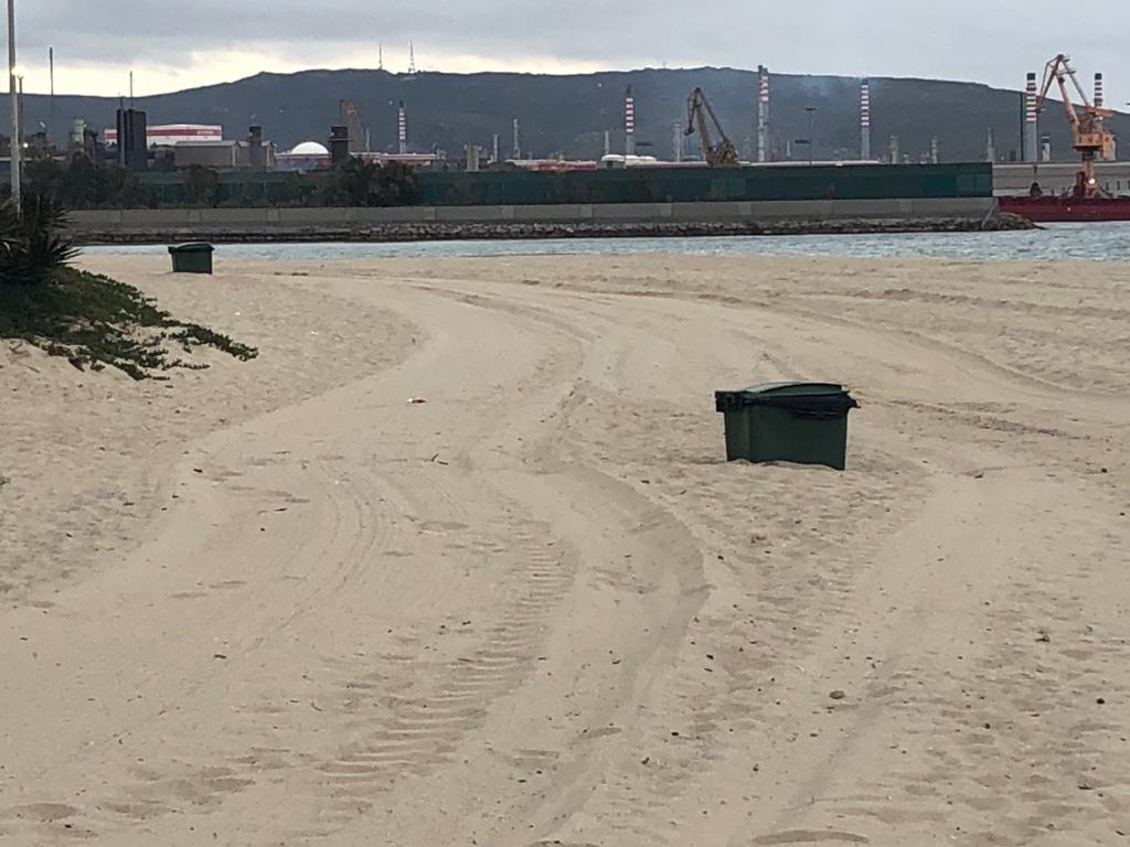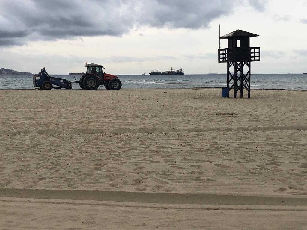 Estos días se han intensificado los trabajos con maquinaria para perfilar la arena, además del refuerzo de nuevas papeleras a lo largo de playa para que los usuarios depositen sus basuras.