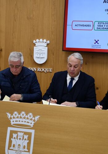El alcalde de San Roque, Juan Carlos Ruiz Boix, y el presidente de la Coordinadora Alternativas, Francisco Mena, han suscrito un convenio de colaboración para el programa “Compleméntate”, una serie de actividades a las que este año han asistido 213 chicos y chicas de entre 12 y 17 años. En la firma también estuvieron presentes Eva Gil, como concejal del departamento organizador, Asuntos Sociales, y la secretaria general del Ayuntamiento, Ana Núñez de Cossío, como fedataria pública.