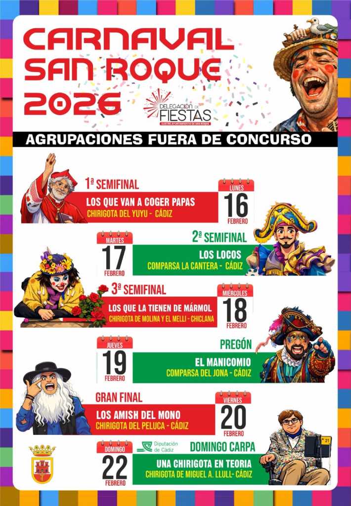 La Delegación de Fiestas del Ayuntamiento de San Roque, que dirige el concejal Abel Heredia, organiza el Carnaval de Calle en San Roque Ciudad, que se desarrollará el sábado 21 y el domingo 22, aunque también participará las delegaciones de Comercio y Juventud, con el teniente David Ramos a la cabeza. Este fin de semana tendrá lugar también el Carnaval de Guadiaro, cuya organización es responsabilidad de la comisión de fiestas de la barriada junto a la Delegación de Fiestas.