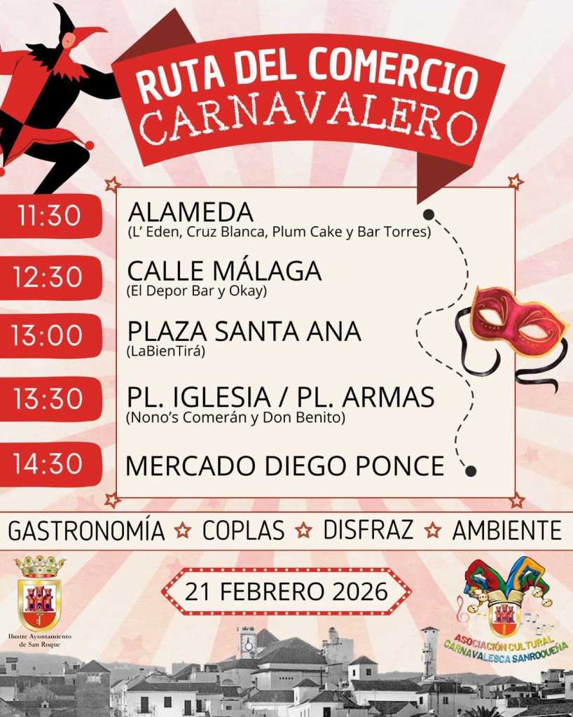 Por la mañana se desarrollará también la Ruta del Comercio Carrnavalero, en la que colabora la Asociación Cultural Carnavalesca Sanroqueña. A las 11.30 horas habrá gastronomía, coplas, disfraces y ambiente en los bares de la Alameda Alfonso XI (L’Eden, Cruz Blanca, Plum Cake y Bar Torres), para desplazarse a las 12.30 a la calle Málaga (El Depor Bar y el Okay). A las 13.00 horas será en LaBienTirá, de la Plaza Santa Ana, y a las 13.30 en las plazas de la Iglesia y de Armas (Nono’s Comerán y Don Benito). Esta ruta finalizará a partir de las 14.30 en el Mercado Diego Ponce.
