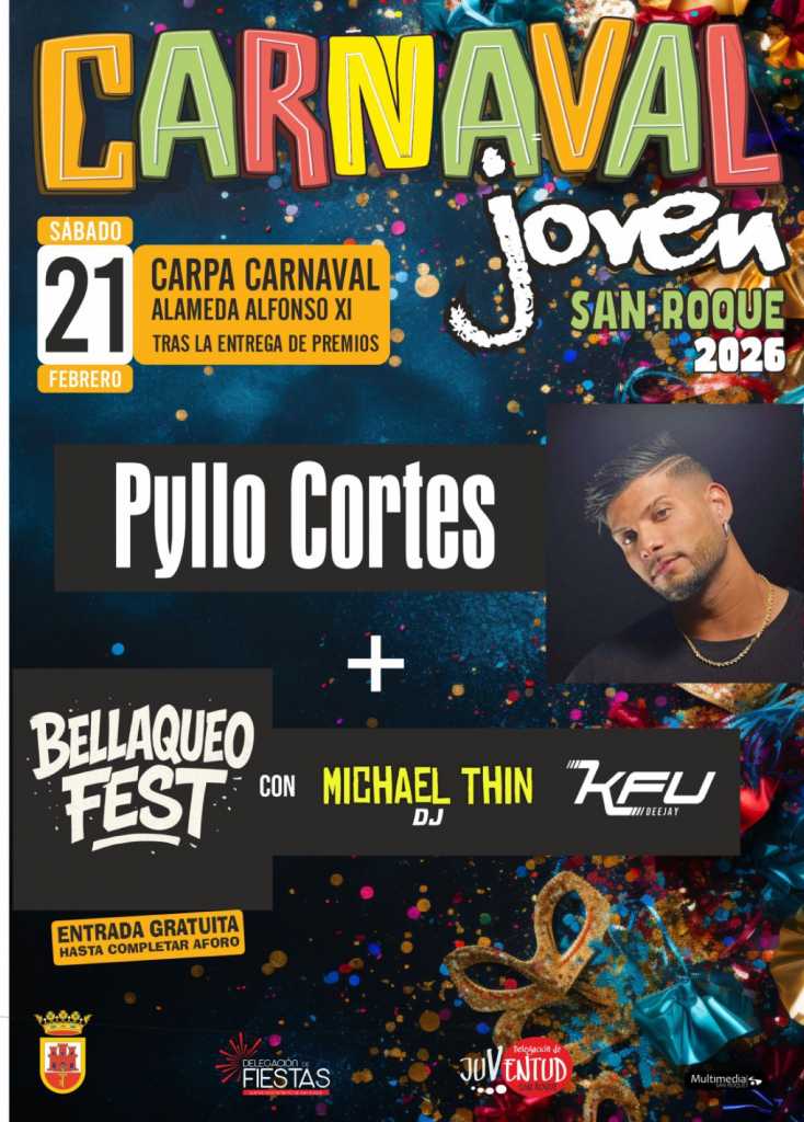 En la tarde del sábado tendrá lugar la Gran Cabalgata del Humor, que partirá a las 18.00 horas desde la Barriada de la Paz, si bien la inscripción en el concurso de disfraces será en el Espacio Joven entre las 16.30 y las 17.45 horas. Se premiarán los mejores disfraces individuales, de parejas y grupos, y a la conclusión de la entrega de premios, que tendrá lugar en la carpa de la Alameda Alfonso XI, comenzará el Carnaval Joven, con entrada gratuita hasta completar aforo. Organizado de manera conjunta por las delegaciones de Fiestas y Juventud, actuará el cantante Pyllo Cortés, y también se podrá disfrutar del Bellaqueo Fest a cargo de los Djs Michael Thin y KFU.