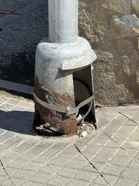Así está la Farola en la Calle Gibraltar por el número 193 , con mucho peligro de que caiga .