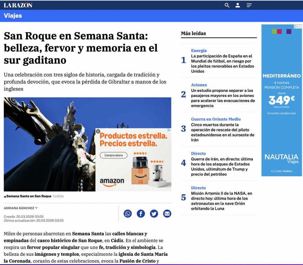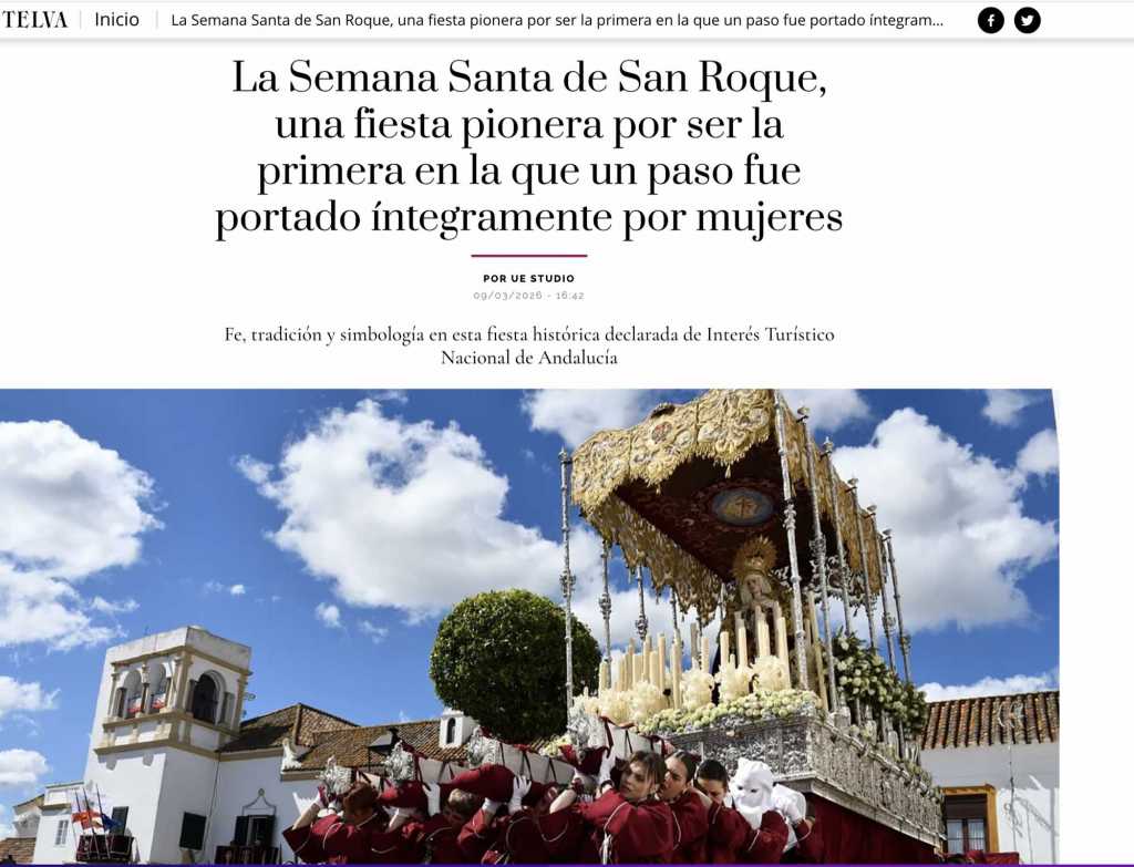 La revista Telva, por su parte, se centró el 9 de marzo en la participación de la mujer en la Semana de Pasión, destacando que fue el primer lugar en el que hubo un paso portado íntegramente por féminas, el de la Virgen de la Merced en 1988. Finalmente, el 20 de marzo, el periódico La Razón publicó otro reportaje enfocado en la historia, especialmente en el origen de San Roque con una procesión en el que los españoles exiliados de Gibraltar en 1704 portaban sus imágenes religiosas.